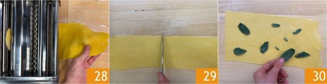 Divisez la pâte en 2 portions et étalez la première partie avec l'aide d'une machine à pâtes 28, en veillant à garder la deuxième portion couverte ; vous devez obtenir des feuilles d'une épaisseur de 1-2 mm. Coupez les feuilles en deux et déposez les feuilles de sauge sur l'une d'elles 30.