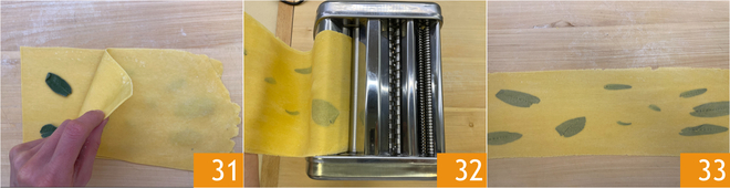 Couvrez avec l'autre moitié de la feuille 31 puis repassez le tout dans la machine à pâtes 32 pour bien les faire adhérer : vous obtenez ainsi des feuilles laminées à la sauge 33. Étalez également la deuxième portion de pâte pour obtenir des feuilles de la même épaisseur, mais dans ce cas, n'ajoutez pas de sauge : elles serviront de base pour les raviolis.
