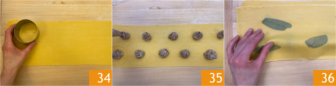 Prenez une feuille de pâte non laminée et appuyez légèrement avec un emporte-pièce de 7,5 cm de diamètre pour marquer le contour d'environ 40 raviolis 34. Pressez une généreuse boule de farce au centre de chaque disque 35, puis vaporisez un peu d'eau et couvrez avec la feuille laminée 36.