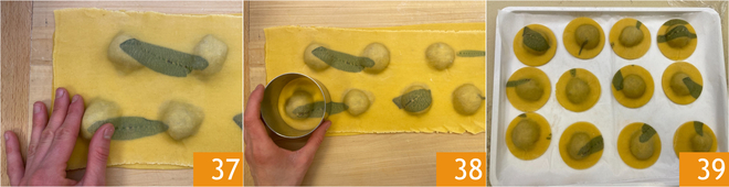 Pressez bien avec les doigts pour faire sortir tout l'air 37 ; si nécessaire, vous pouvez faire un petit trou dans la feuille avec un cure-dent pour éliminer l'air restant, puis le refermer. Enfin, découpez les raviolis en les découpant avec le même emporte-pièce utilisé précédemment 38. Disposez les raviolis sur un plateau 39 et mettez-les au congélateur pendant au moins 2 heures ; de cette façon, ils conserveront mieux leur forme pendant la cuisson.