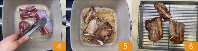 Prenez une cocotte en fonte et chauffez-la bien avec un filet d'huile de graines, puis déposez les côtes et scellez-les de tous les côtés, en les touchant le moins possible 4. Lorsque la viande est bien dorée 5, transférez-la sur une grille 6 et laissez le fond de cuisson dans la casserole.