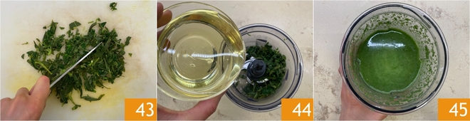 Égouttez bien l'eau en excès et hachez-les grossièrement au couteau 43. Mettez les herbes dans un mixeur, ajoutez l'huile de graines 44 et mixez pour obtenir un mélange homogène 45.