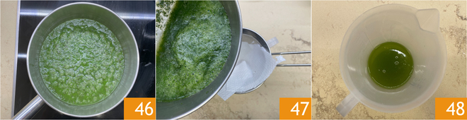 Versez le mélange dans une petite casserole et laissez-le frémir pendant 30 secondes 46, puis filtrez-le avec un tamis tapissé d'un torchon ou d'une étamine 47. Laissez reposer l'huile obtenue pendant 30 minutes 48, après quoi vous verrez une différence de couleur : éliminez les impuretés et conservez la partie restante.