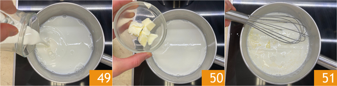 Chauffez le lait et la crème dans une petite casserole à feu vif 49, puis ajoutez le beurre 50 et mélangez pour le faire fondre 51.
