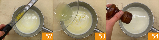 Retirez la casserole du feu et ajoutez le zeste 52 et le jus de citron 53. Assaisonnez avec du sel et du poivre blanc 54, puis laissez reposer.