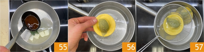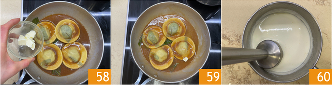 Reprenez le fond de cuisson réduit et versez-le dans une poêle avec une partie du beurre 55, puis faites-le fondre doucement. Entre-temps, plongez les raviolis congelés dans l'eau bouillante salée, en veillant à ce qu'elle ne bout pas trop vigoureusement pour éviter qu'ils ne s'ouvrent 56. Faites cuire les raviolis pendant environ 5 minutes, puis égouttez-les et transférez-les dans la poêle avec l'assaisonnement 57.