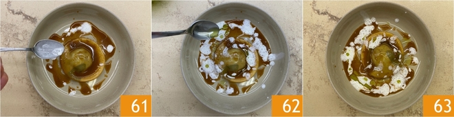 Ajoutez le beurre restant 58 et secouez doucement la poêle pour les enrober sans risquer de les casser 59. À ce stade, reprenez la mousse au citron et mixez brièvement avec un mixeur plongeant pour former une légère mousse 60.