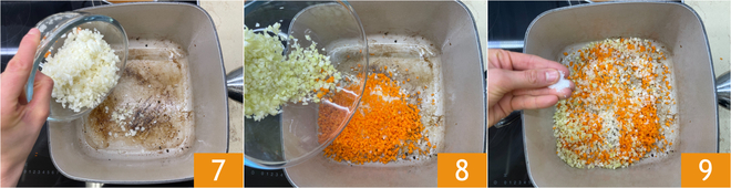 Ajoutez au fond de cuisson l'oignon 7, les carottes et le céleri hachés très finement 8, puis salez 9 et laissez mijoter doucement pendant une dizaine de minutes, en remuant souvent.