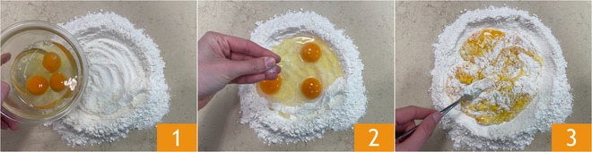 Pour préparer les ravioles farcies au coquelet, commencez par disposer la farine en fontaine sur un plan de travail et mettez les œufs au centre 1. Ajoutez une pincée de sel 2 et incorporez progressivement la farine avec une fourchette 3.