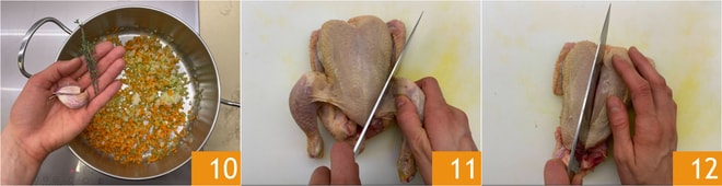Ajoutez également deux gousses d'ail écrasées en chemise et un brin de thym et de romarin 10. Faites revenir à feu doux pendant 5 minutes ou jusqu'à ce que les légumes soient tendres. Pendant ce temps, coupez le coquelet en morceaux 11 12.