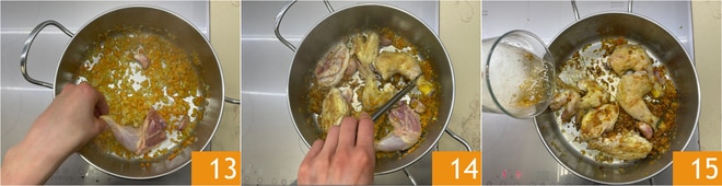 Ajoutez les morceaux de coquelet dans la casserole 13 et faites dorer chaque côté jusqu'à obtenir une belle coloration 14. Versez la bière dans la casserole 15.
