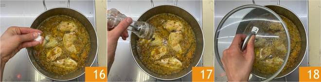 Rectifiez l'assaisonnement en sel 16 et poivre 17. Couvrez avec un couvercle 18 et laissez cuire pendant environ 1 heure ou jusqu'à ce que la viande se défasse facilement.