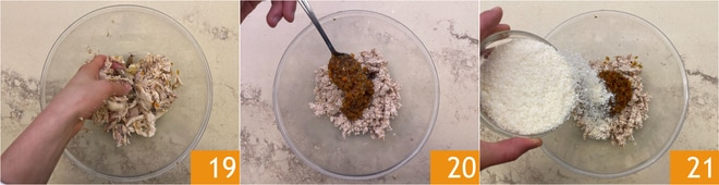 Retirez la viande de la casserole et laissez refroidir un peu. Ensuite, effilochez la viande 19, en éliminant la peau et les os, et transférez-la dans un bol. Ajoutez le jus de cuisson, les légumes 20 et le Parmesan 21.