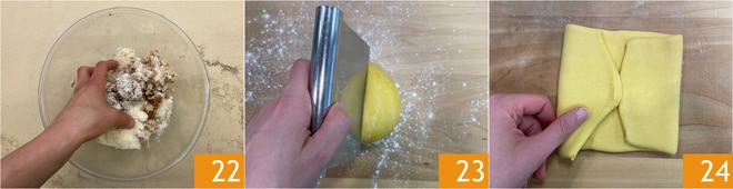 Mélangez 22 jusqu'à obtenir un mélange homogène. Laissez refroidir complètement et mettez le tout dans une poche à douille. Reprenez la pâte et divisez-la en deux 23. Étalez les bandes de pâte avec un laminoir. Commencez par l'épaisseur la plus grande, puis repliez les extrémités de la pâte vers le centre 24. Passez-la à nouveau entre les rouleaux en réduisant progressivement l'épaisseur.