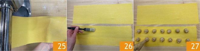 Poursuivez de cette manière jusqu'à obtenir 2 bandes de pâte d'une épaisseur de 2-3 mm 25. Badigeonnez une bande de pâte avec de l'eau 26 et déposez des petits tas de farce à une distance de 3-4 cm les uns des autres 27.