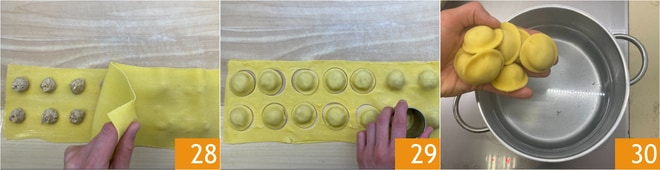 Couvrez avec la deuxième bande de pâte 28. Essayez d'éliminer l'air autour de la farce et faites bien adhérer les deux bandes de pâte, de cette manière les ravioles ne s'ouvriront pas à la cuisson. Avec un emporte-pièce, donnez forme à vos ravioles 29. Faites-les cuire dans de l'eau bouillante salée pendant 3-4 minutes 30, jusqu'à ce qu'elles remontent à la surface.