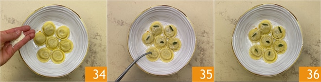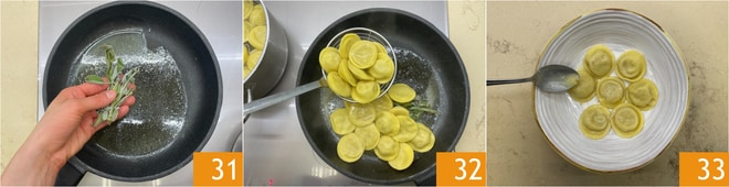 Entre-temps, faites fondre le beurre dans une poêle, ajoutez les feuilles de sauge 31. Égouttez les ravioles et transférez-les dans la poêle 32, faites-les sauter délicatement pendant quelques minutes. Dressez dans les assiettes et ajoutez le beurre fondu 33.