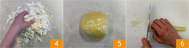 Puis pétrissez avec les mains 4 jusqu'à obtenir une boule de pâte lisse et homogène. Enveloppez-la dans du film plastique 5 et laissez reposer dans un endroit frais et sec pendant au moins 30 minutes. Pendant ce temps, coupez le céleri en petits cubes 6.