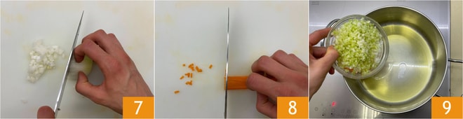 Émincez finement l'oignon 7 et les carottes 8. Dans une casserole, versez un filet d'huile et ajoutez les légumes 9.
