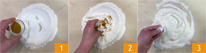Pour préparer les raviolis chinois au poulet et au curry, commencez par la pâte : versez la farine en fontaine sur le plan de travail, parfumez-la avec le curry 1 et incorporez-le avec des baguettes ou à la main 2, puis ajoutez une pincée de sel 3.