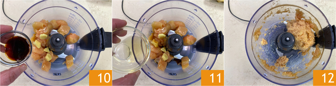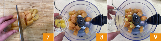 Pendant ce temps, occupez-vous de la farce : coupez le blanc de poulet en dés 7 et mettez-les dans un mixeur. Ajoutez le gingembre 8 et le vin de riz 9.