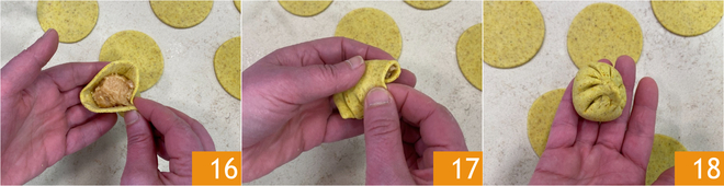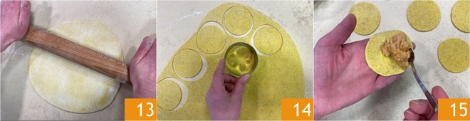 Au terme du repos de la pâte, étalez-la sur le plan de travail légèrement fariné jusqu'à une épaisseur d'environ 2 mm 13. Découpez des disques avec un emporte-pièce de 8-9 cm de diamètre ; avec ces quantités vous en obtiendrez une vingtaine 14. Prenez un disque de pâte et placez une cuillerée à café de garniture au centre 15.