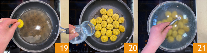 Passez à la cuisson : chauffez un filet d'huile végétale dans une poêle antiadhésive, puis déposez les raviolis 19 et faites-les dorer à feu moyen pendant 2 minutes. Lorsque la base est dorée, versez l'eau 20 et couvrez immédiatement avec le couvercle 21.