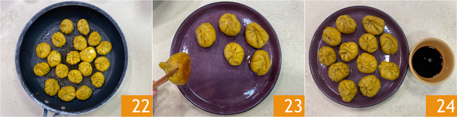 Faites cuire pendant environ 5–6 minutes. Quand l'eau sera évaporée, retirez le couvercle et laissez grésiller encore 30 secondes pour rendre la base croustillante 22. Dressez 23 et servez vos raviolis chinois au poulet et au curry avec un ramequin de sauce soja 24 !