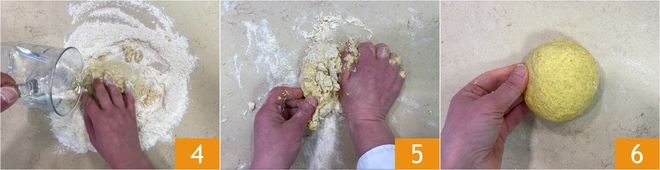 Versez progressivement l'eau tiède en filet tout en pétrissant à la main 4, puis continuez de travailler pendant une dizaine de minutes 5 jusqu'à obtenir une boule lisse, élastique et homogène 6. Enveloppez-la dans un film alimentaire et laissez reposer 30 minutes dans un endroit frais et sec.