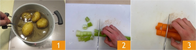 Pour préparer les raviolis de poisson aux trois pâtes, commencez par faire bouillir les pommes de terre dans de l'eau pendant environ 30 minutes après l'ébullition, jusqu'à ce qu'elles soient tendres 1. Pendant ce temps, occupez-vous des légumes qui cuiront avec le poulpe : nettoyez et coupez le céleri en morceaux 2 et la carotte 3.
