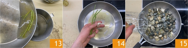 Filtrez le jus de cuisson et réservez-le 13. Maintenant, cuisez de la même façon les palourdes : chauffez dans la poêle l'ail et les tiges de persil 14, puis versez les palourdes et l'eau 15.