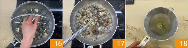 Couvrez avec le couvercle 16 et cuisez pendant environ 5 minutes, jusqu'à ce qu'elles s'ouvrent 17. Décortiquez les palourdes, filtrez leur jus de cuisson 18 et placez-les au réfrigérateur.