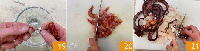 Nettoyez les crevettes rouges : retirez la tête et la carapace, puis extrayez l'intestin 19. Hachez les crevettes pour en faire un tartare 20. Reprenez le poulpe cuit et filtrez aussi son jus, mélangez-le ensuite avec celui des moules et des palourdes pour créer un fond de cuisson. Retirez la tête du poulpe et hachez grossièrement les tentacules 21.