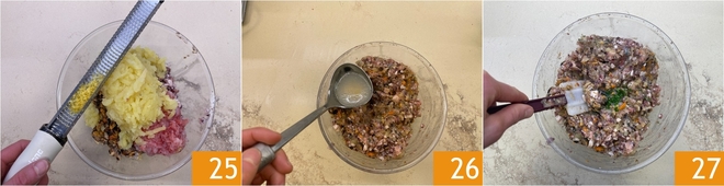 Assaisonnez avec le zeste de citron 25, un filet d'huile et les feuilles de persil hachées. Mélangez pour amalgamer, puis ajustez la consistance du mélange en ajoutant une louche de jus de cuisson du poulpe, des moules et des palourdes 26. Transférez la farce dans une poche à douille sans embout et conservez-la au réfrigérateur.