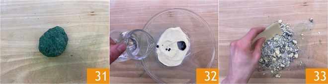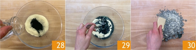 Vous devez obtenir une boule compacte 31; peu importe si elle n'est pas homogène, car la semoule est plus tenace. Enveloppez-la dans du film alimentaire et laissez reposer 30 minutes au réfrigérateur. Passez à la pâte noire : dans un bol, versez la semoule, l'encre de seiche et l'eau 32. Procédez de la même manière, en mélangeant d'abord avec une cuillère puis à la main sur le plan de travail 33.