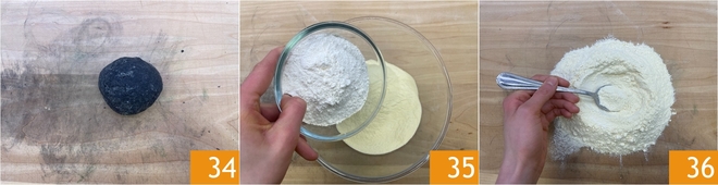 Formez une boule, couvrez-la de film alimentaire et laissez-la reposer 30 minutes au réfrigérateur 34. Pour finir, préparez la troisième pâte, celle aux œufs : dans un bol, mélangez la semoule et la farine 00 35. Transférez les farines sur le plan de travail et formez une fontaine 36.