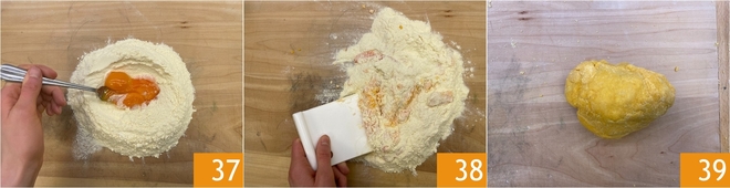 Versez les jaunes d'œufs au centre 37 et pétrissez 38 jusqu'à obtenir une boule homogène 39. Enveloppez-la dans du film alimentaire et laissez-la reposer 30 minutes au réfrigérateur.