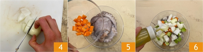Nettoyez et coupez également grossièrement l'oignon 4. Mettez le poulpe nettoyé dans un bol, ajoutez les légumes 5 et assaisonnez avec l'huile 6 et le sel, en massant bien avec vos mains pour imprégner de saveur.