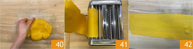 Récupérez la boule de pâte aux œufs et aplatissez-la légèrement 40, puis passez-la dans les rouleaux de la machine à pâtes 41 : saupoudrez-la de semoule et partez de l'épaisseur la plus large jusqu'à celle la plus fine (on doit voir l'ombre de la main à travers la pâte) 42. Couvrez les feuilles avec un torchon pour ne pas les laisser sécher.