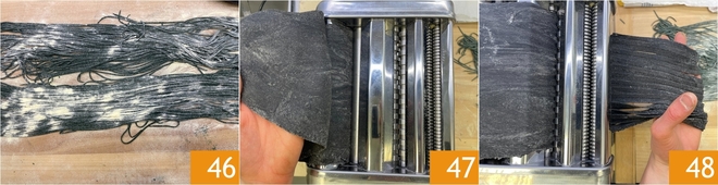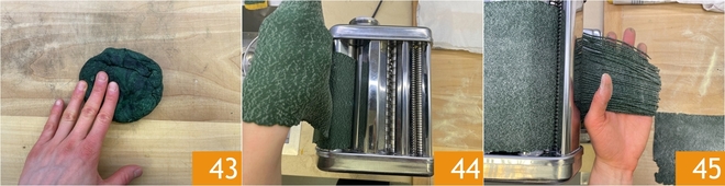 Étalez la pâte à la spiruline : aplatissez la boule 43, passez-la dans les rouleaux de la machine à pâtes jusqu'à l'avant-dernier épaisseur 44, puis découpez des tagliolini en utilisant le rouleau approprié 45.