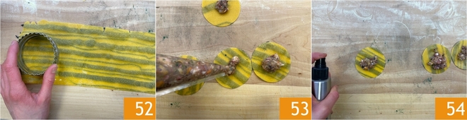 Composez les raviolis : retournez la feuille tricolore et découpez des disques avec un emporte-pièce lisse de 7 cm de diamètre 52. Garnissez le centre des disques de pâte avec la farce de poisson 53, puis vaporisez les bords avec de l'eau 54.