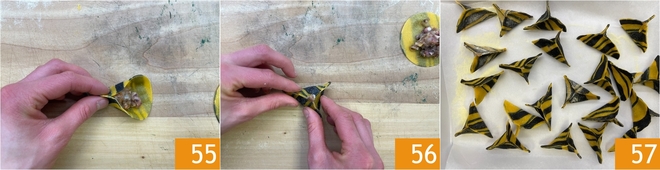 Plierez la pâte 55 de manière à ce que le bord coïncide en 3 points, comme pour former un hélice 56. Déposez au fur et à mesure les raviolis sur un plateau recouvert de papier sulfurisé 57.