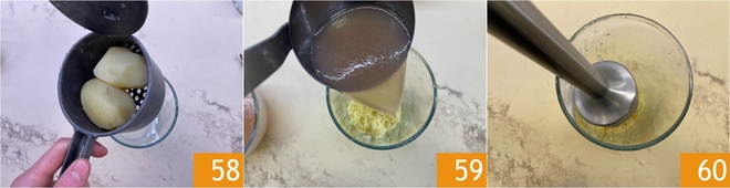 Enfin, préparez le velouté : faites cuire les pommes de terre pendant environ 30 minutes, ou jusqu'à ce qu'elles soient tendres, puis réduisez-les en purée avec un presse-purée 58. Ajoutez à la purée 700 g du fond de cuisson des moules, des palourdes et du poulpe 59, ou autant qu'il en faut pour obtenir une consistance lisse. Mixez avec le mixeur plongeant 60.