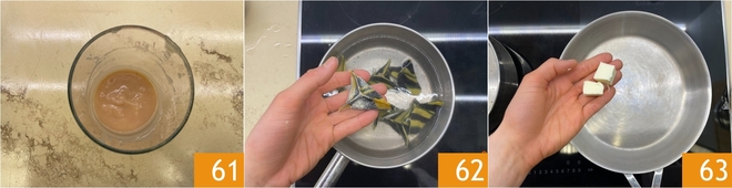 Le velouté est prêt 61, chauffez-le dans une petite casserole, en le portant à ébullition, juste avant de servir. Maintenant, cuisez les raviolis dans de l'eau bouillante salée 62 et en attendant, faites fondre le beurre dans une grande poêle 63.