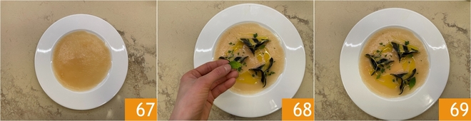 Versez le velouté de pommes de terre à la base de l'assiette 67, puis déposez les raviolis et garnissez avec du persil haché et des feuilles de basilic 68. Les raviolis de poisson aux trois pâtes sont prêts à être servis 69!