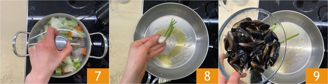 Chauffez une grande casserole, transférez le poulpe et les légumes à l'intérieur et, d'un mouvement rapide, couvrez avec le couvercle 7. Cuisez pendant 30 minutes à feu doux. Puis laissez reposer encore 30 minutes hors du feu avec le couvercle. Entre-temps, occupez-vous des moules : dans une poêle, chauffez l'huile avec l'ail et les tiges de persil 8, puis versez les moules nettoyées 9 et l'eau.