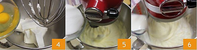 Vous pouvez alors passer à la préparation de la crème : placez dans un robot culinaire le fromage et les deux œufs 4, mettez en marche les fouets pour mélanger le tout et ajoutez ensuite le sucre en poudre 5. Si vous ne possédez pas de robot, vous pouvez travailler les ingrédients dans un grand bol avec un batteur électrique ou un fouet à main. Ajoutez l'extrait de vanille et incorporez également la crème liquide en filet 6 tout en continuant à mélanger.