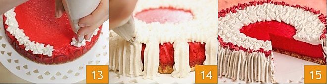 Vous pouvez maintenant procéder à la décoration du gâteau : une fois le temps de cuisson terminé, sortez le cheesecake du four et démoulez-le sur un plat de service. Laissez-le refroidir ; pendant ce temps, remplissez une poche à douille avec une buse en étoile avec la crème précédemment montée et commencez à garnir votre cheesecake Red Velvet avec des touffes de crème fouettée le long de la circonférence du gâteau et presque jusqu'au centre, en décorant également les bords (13-14). Vous pouvez terminer la garniture à votre goût, par exemple avec des vermicelles de sucre colorés pour donner un contraste rouge vif à votre cheesecake Red Velvet 15 !