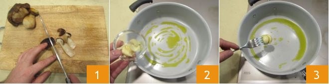 Pour préparer les rigatoni aux cèpes et fruits des bois, commencez d'abord par prendre les cèpes et lavez-les délicatement (pour plus de détails sur le nettoyage des cèpes, cliquez ici). Disposez ensuite les cèpes lavés sur une planche à découper et coupez-les en tranches 1. Prenez maintenant une poêle antiadhésive, arrosez-la d'un filet d'huile et faites dorer une gousse d'ail 2. Lorsque l'ail est doré, retirez-le du feu 3.