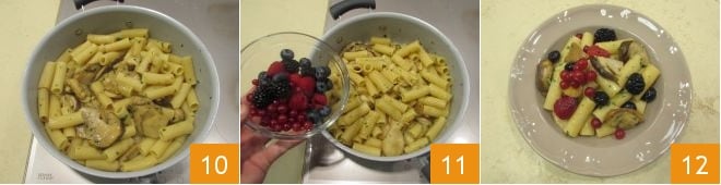 Versez les rigatoni que vous avez égouttés al dente dans la poêle où vous avez fait cuire les champignons et mélangez les ingrédients pour qu'ils s'amalgament de manière uniforme 10. Si la sauce est trop sèche, ajoutez un peu d'eau de cuisson. Quelques minutes avant de retirer la poêle du feu, ajoutez les fruits des bois 11 en en réservant quelques-uns pour la décoration, et incorporez-les délicatement aux pâtes pour qu'ils restent le plus entier possible. Servez ensuite les rigatoni aux cèpes et fruits des bois en les décorant avec une poignée de fruits des bois frais, et profitez des compliments de vos convives 12 !